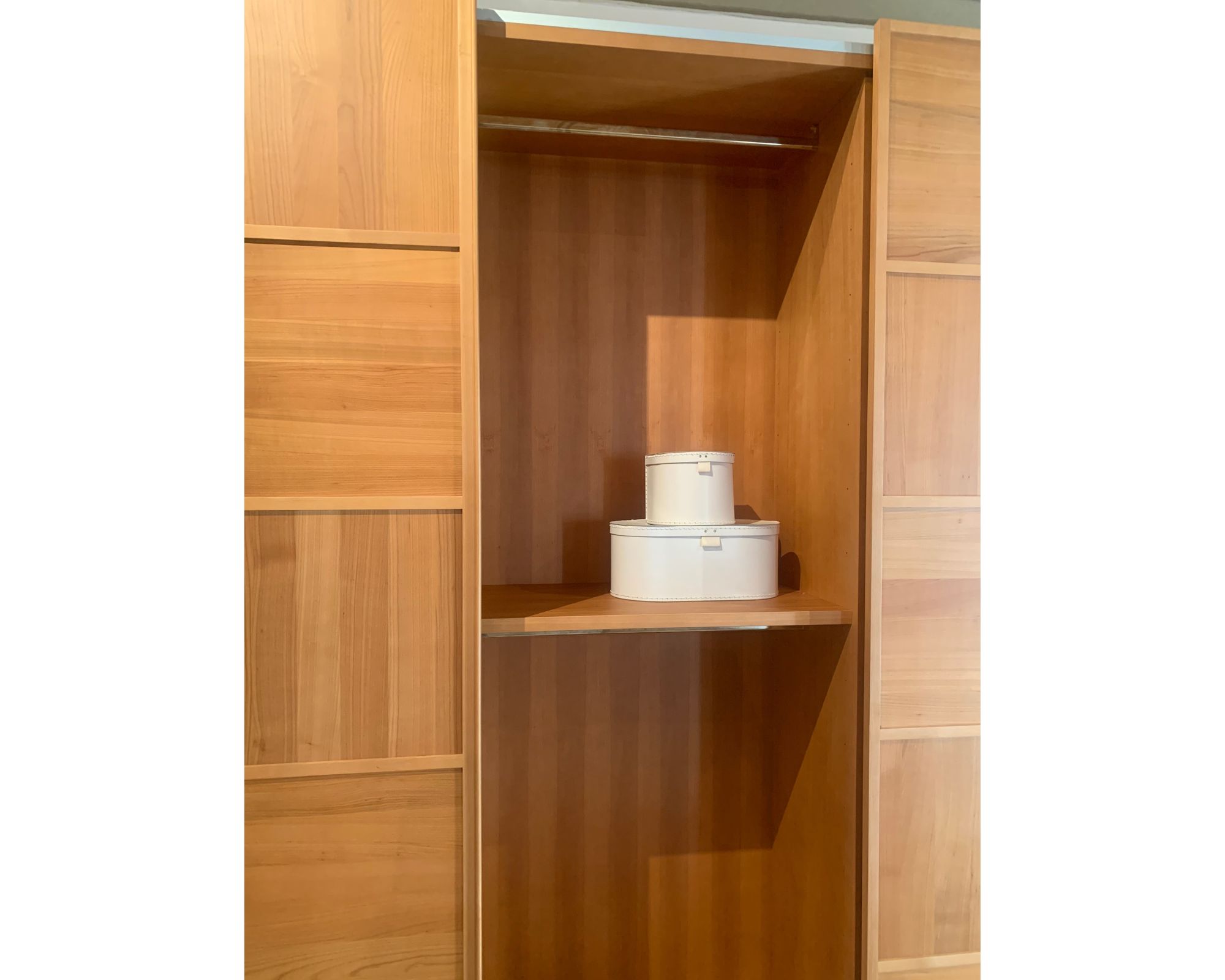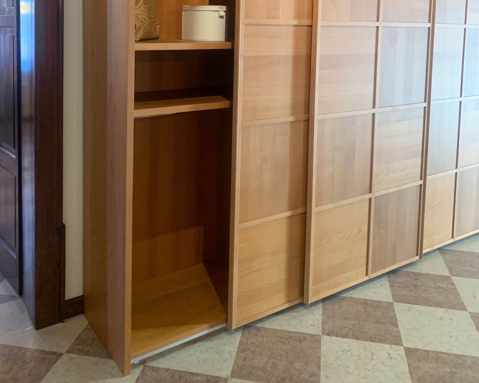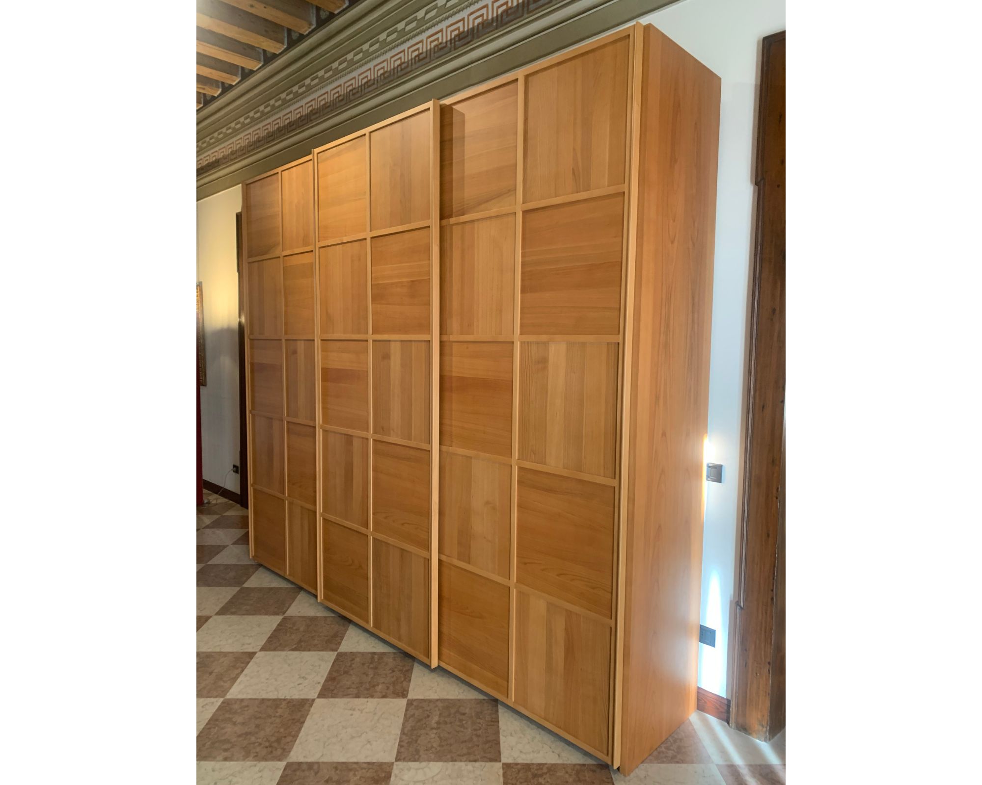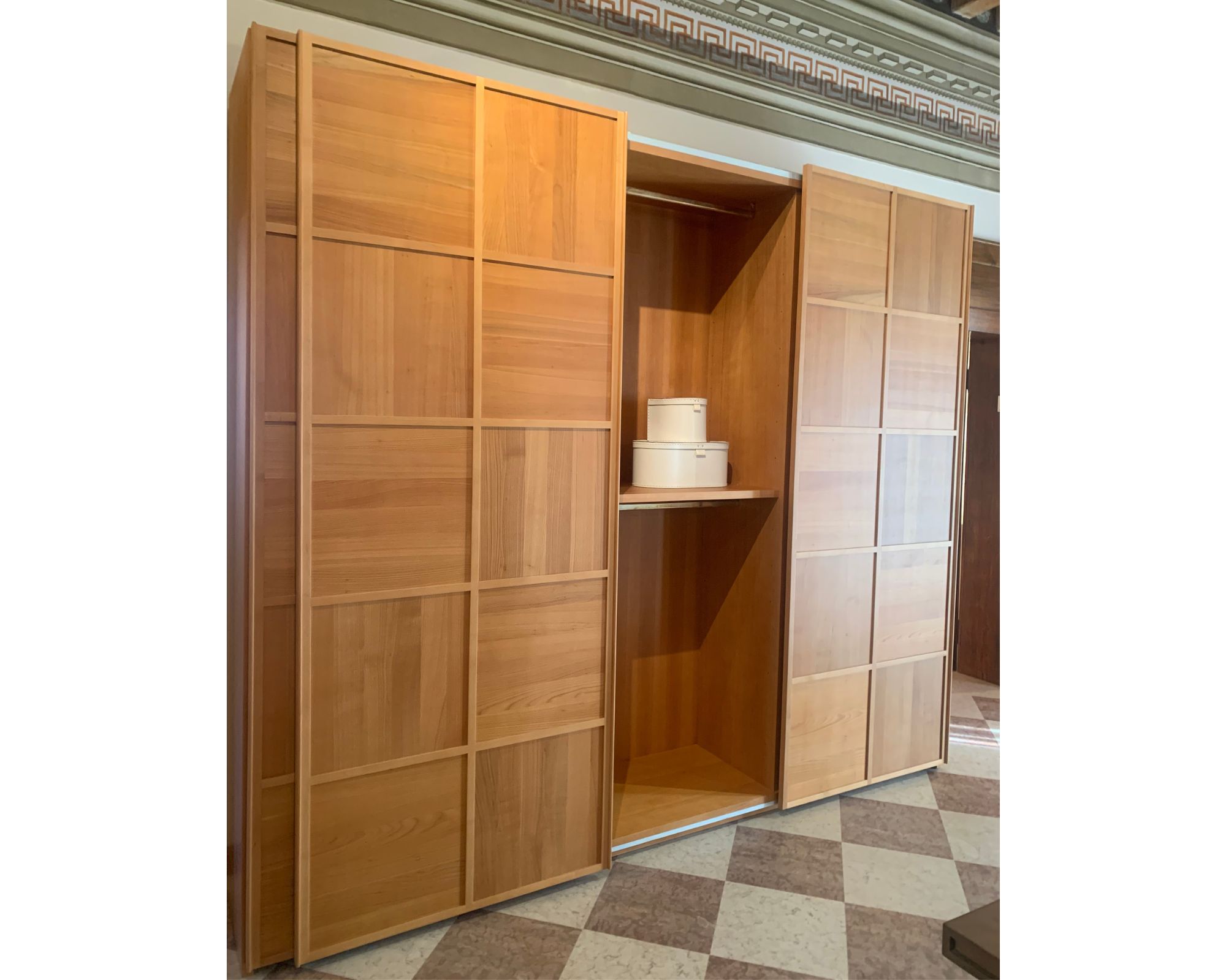 Guardaroba in legno di ciliegio con 3 ante scorrevoli con lavorazione a scacchiera. Contiene 5 ripiani in legno ad altezza regolabile e 5 aste appendiabiti.