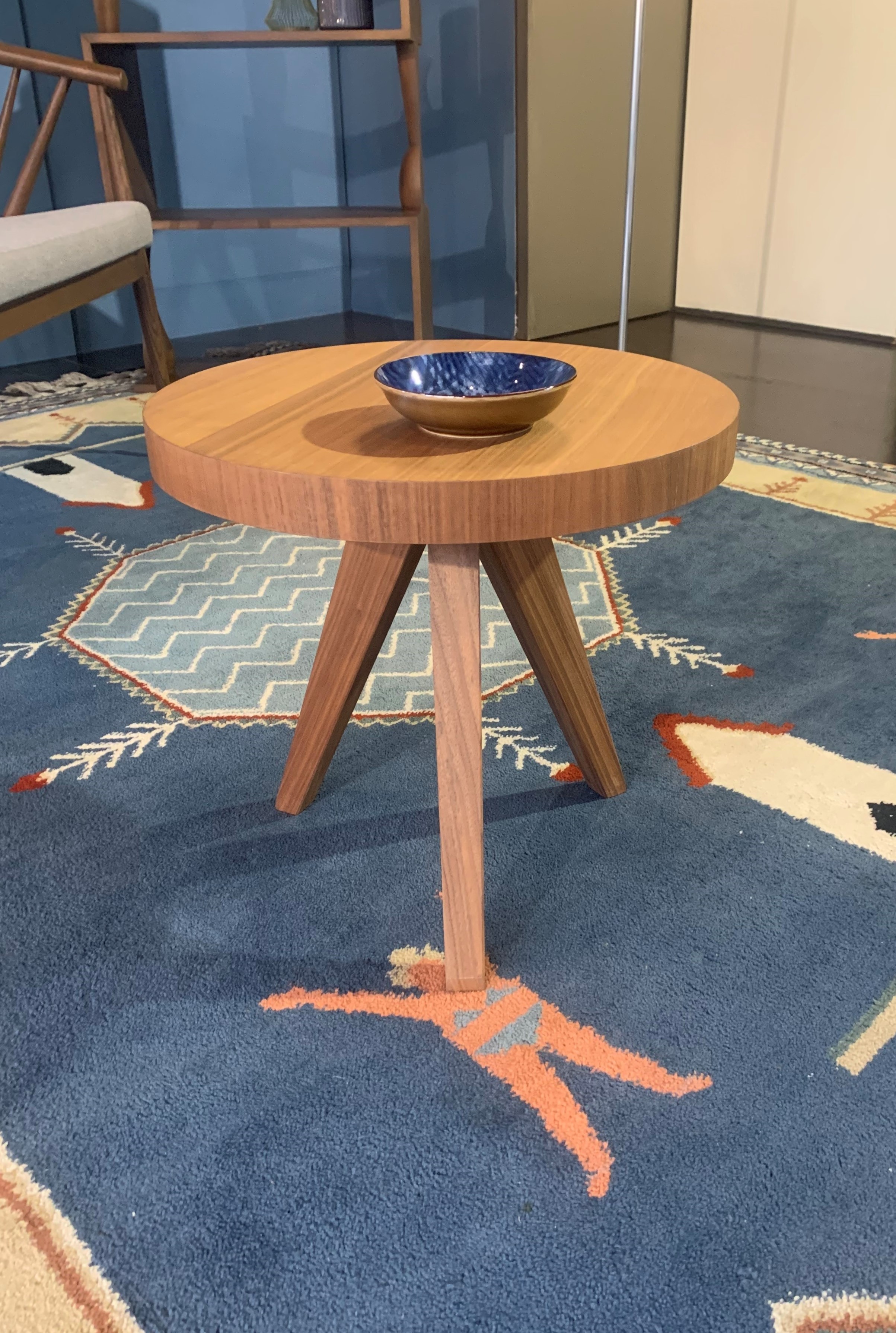 Piccolo tavolino rotondo in legno di noce. Spessore piano H 4 cm.