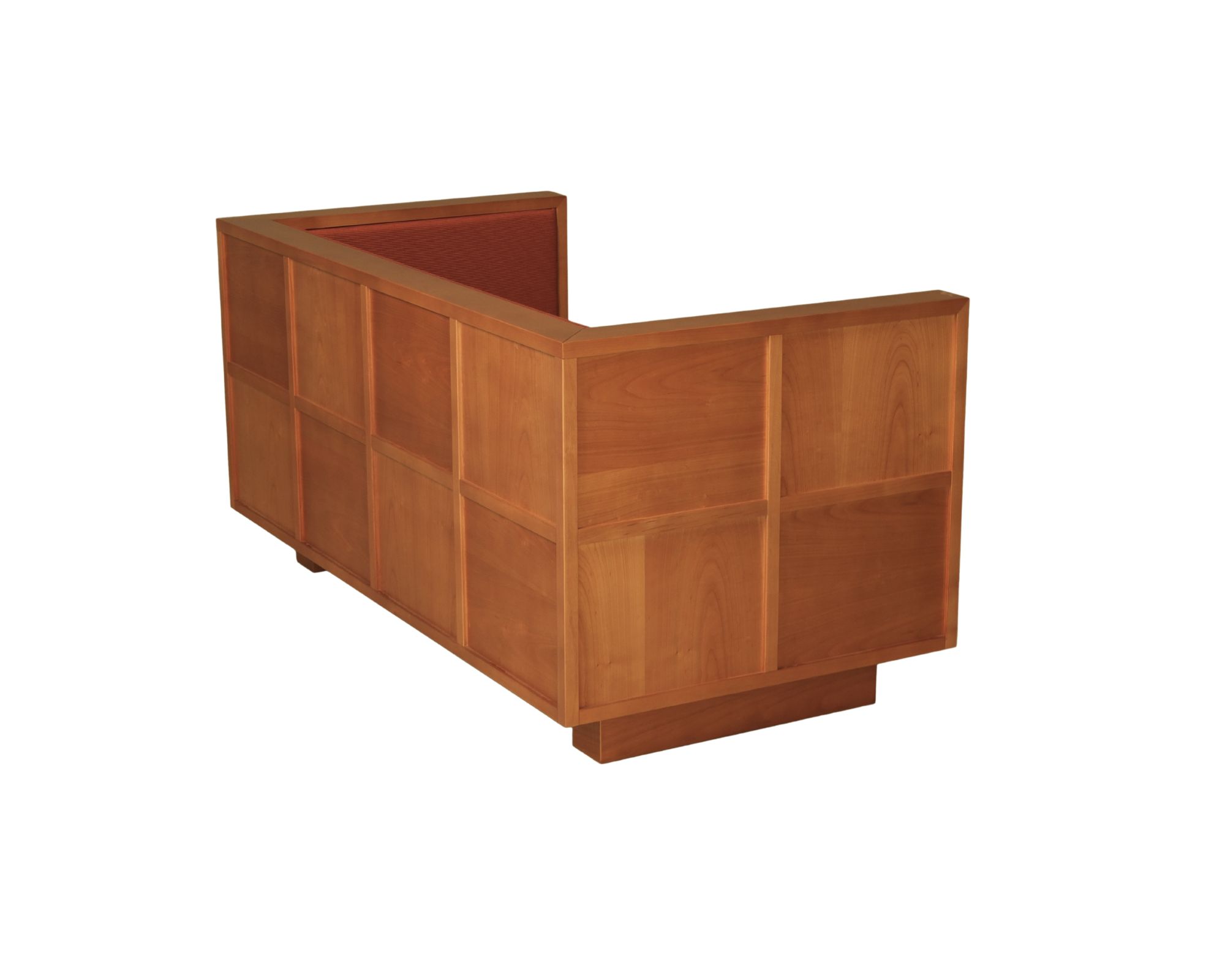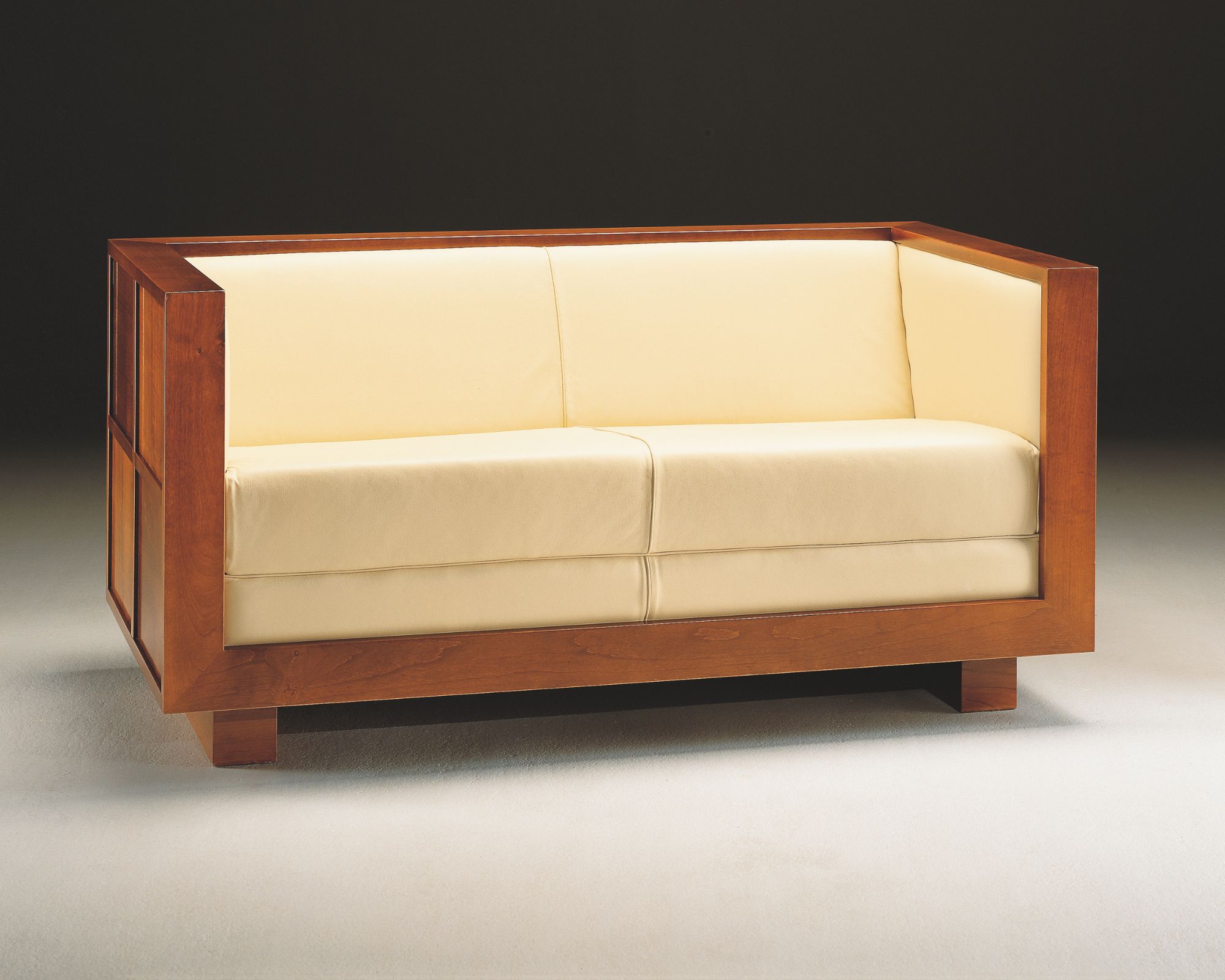 Piccolo sofa da conversazione con preziosa struttura realizzata in legno di ciliegio interamente lavorata con scacchiera. Rivestimento interno in pelle naturale. Ultimi pezzi al grezzo realizzabili con colore struttura e colore pelle a scelta. Nella galleria foto i colori disponibili su legno di ciliegio.