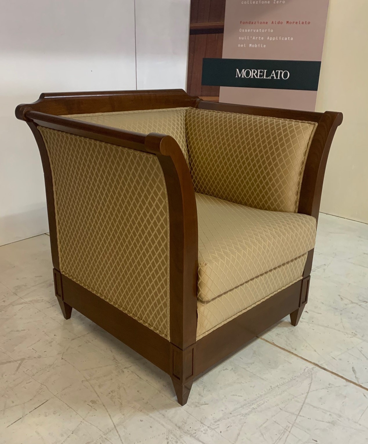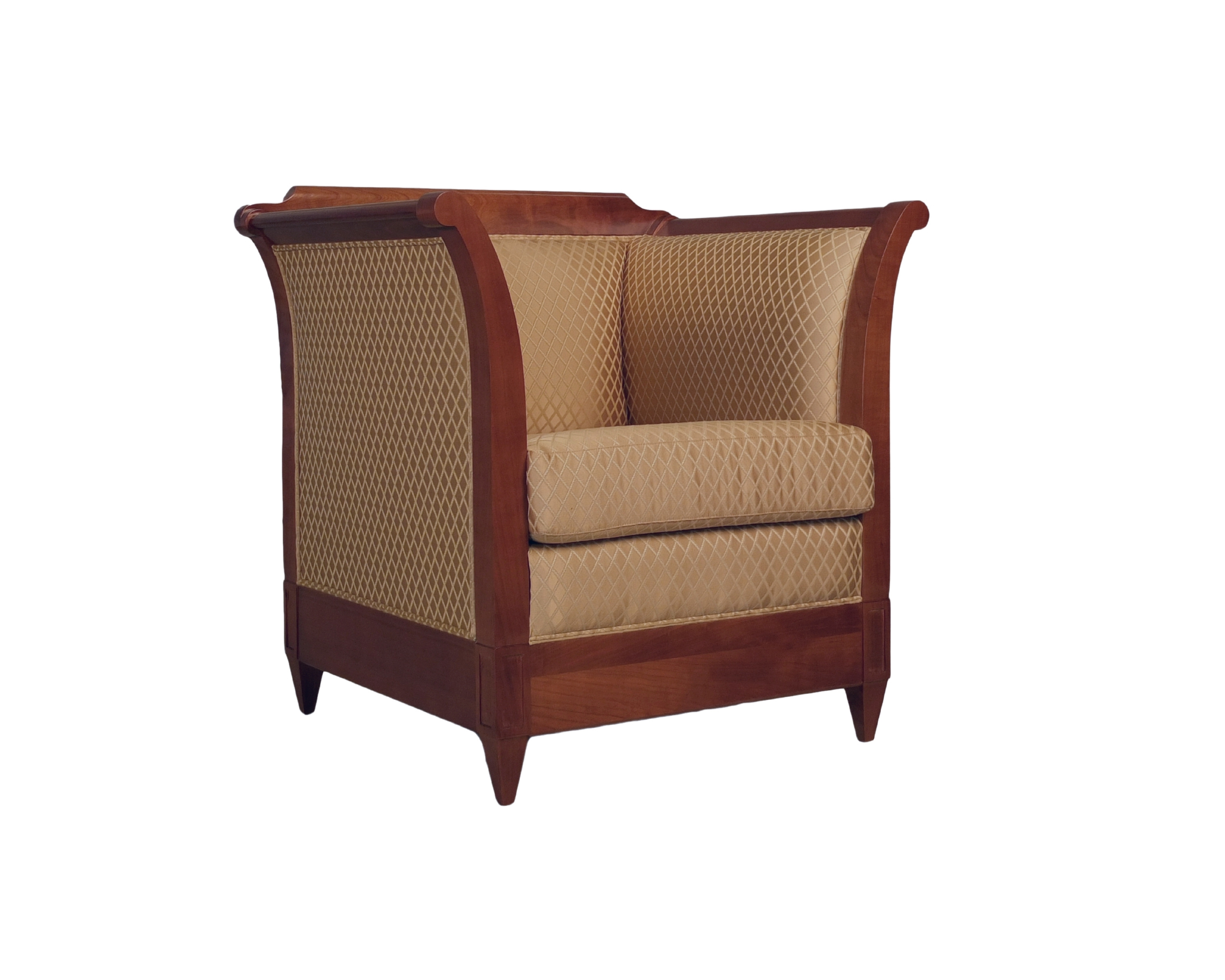 Poltrona in legno di ciliegio con rivestimento interno ed esterno della struttura in tessuto di cotone con motivo a rombi, tonalità dorata.