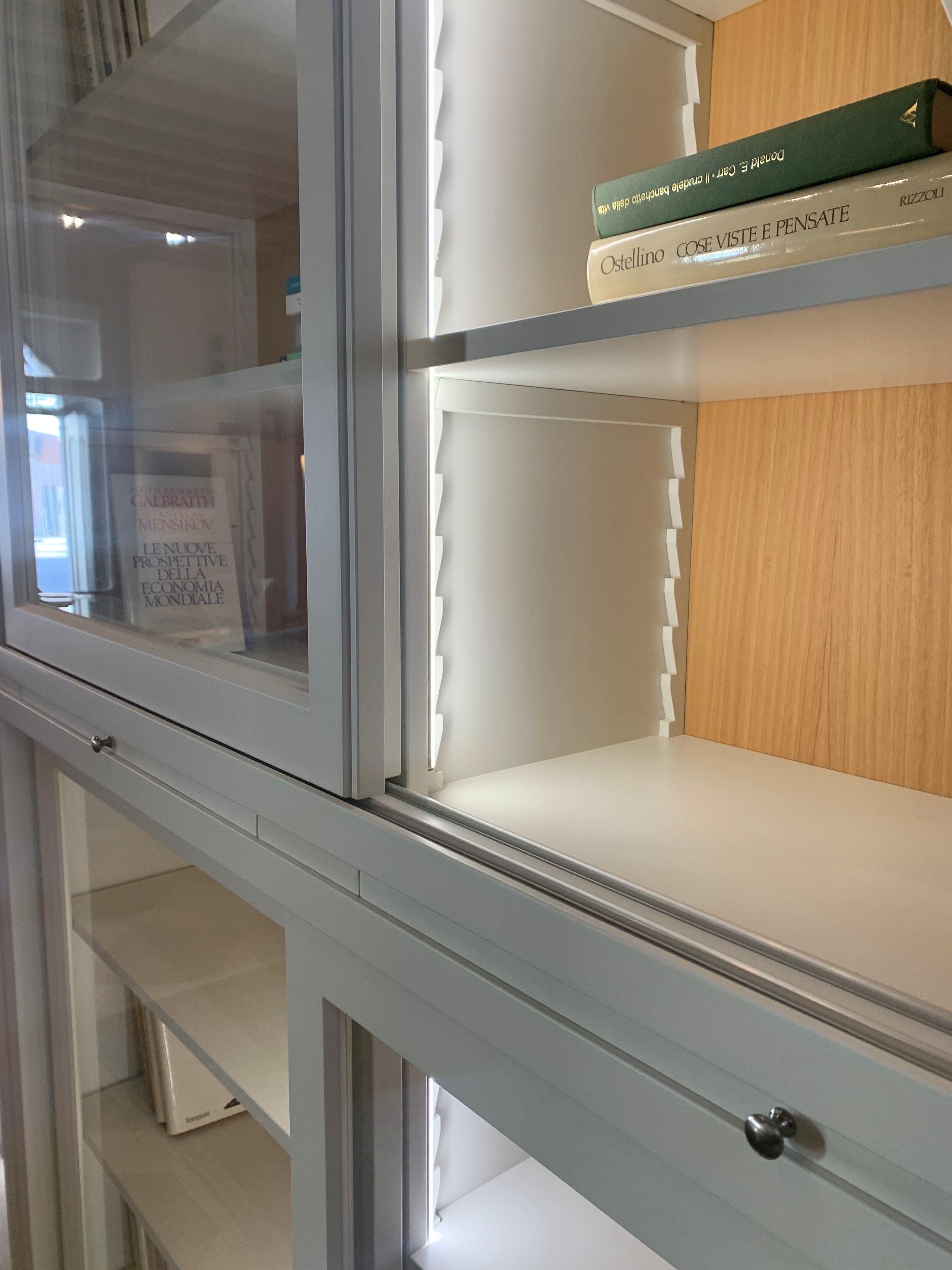 Libreria componibile in legno di ciliegio, formata da 4 moduli con ante scorrevoli con vetri temperati. Ripiani interni regolabili su scaletta di legno e fianchi in vetro. Presenta 4 tiretti in legno estraibili posizionati sopra i moduli base. Illuminazione interna LED completa di trasforatore.