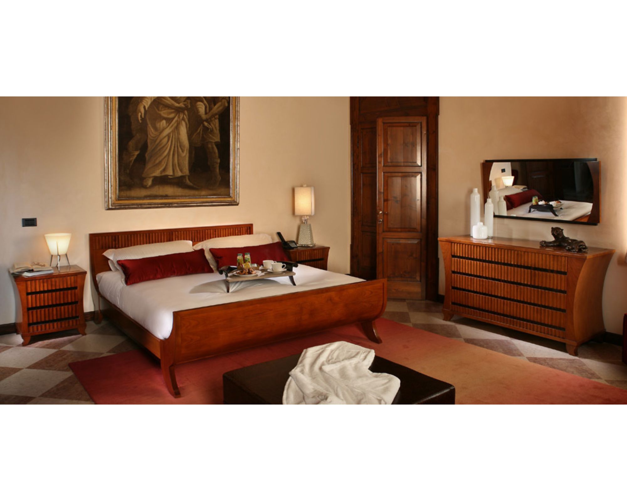 Coppia di comodini con cassettone abbinato, realizzati in legno di ciliegio con elegante lavorazione a fresatura a lesene dei frontali. I pezzi sono al grezzo con finitura a scelta. Nella galleria foto i colori disponibili. Misure comodino: L 56 P 40 H 60 cm Misure cassettone: L 138 P 54 H 86 cm