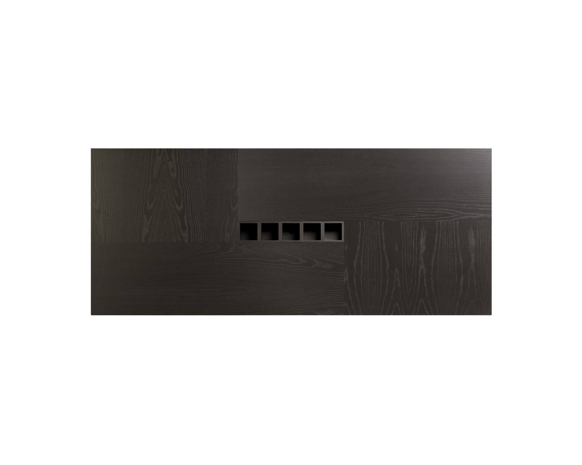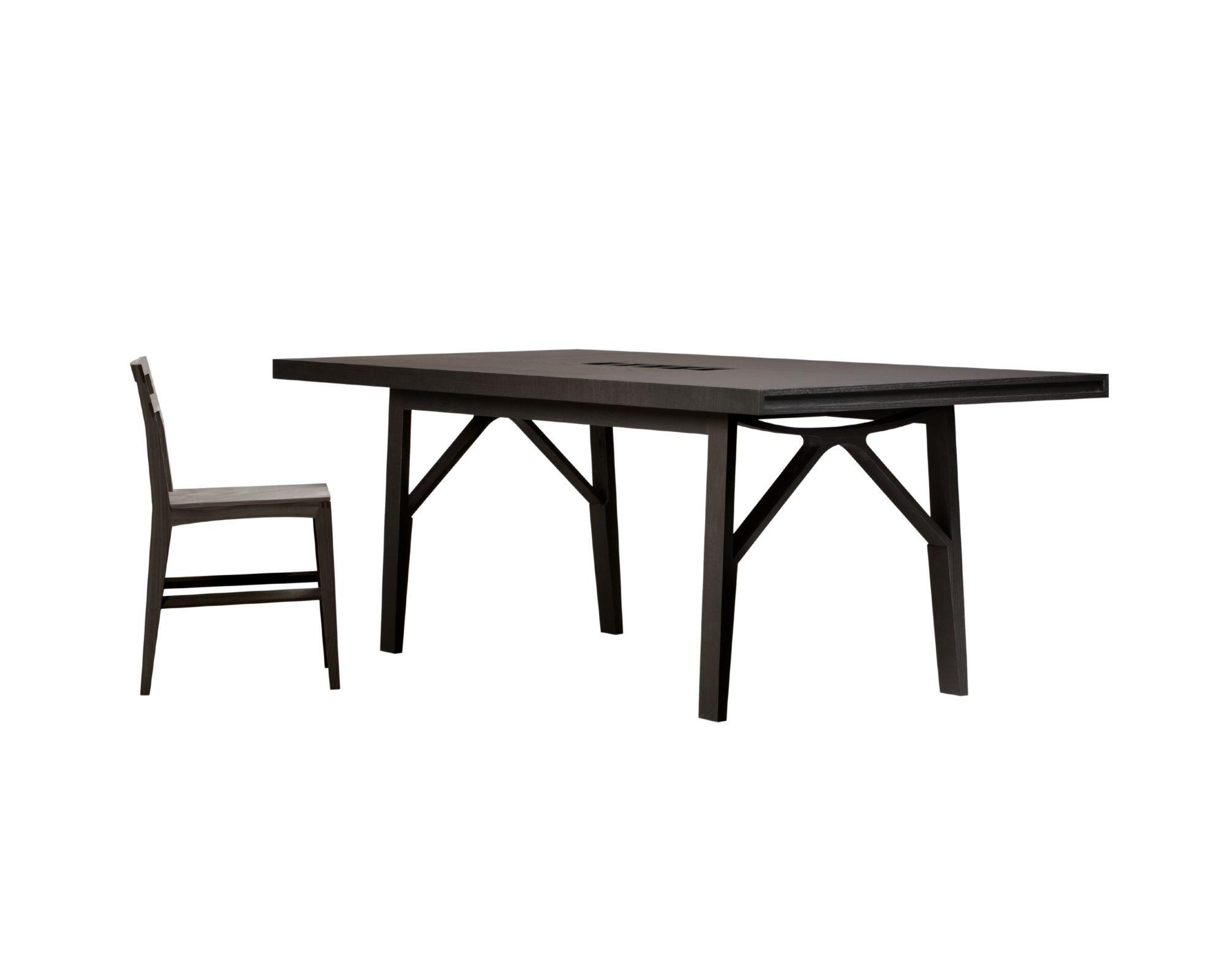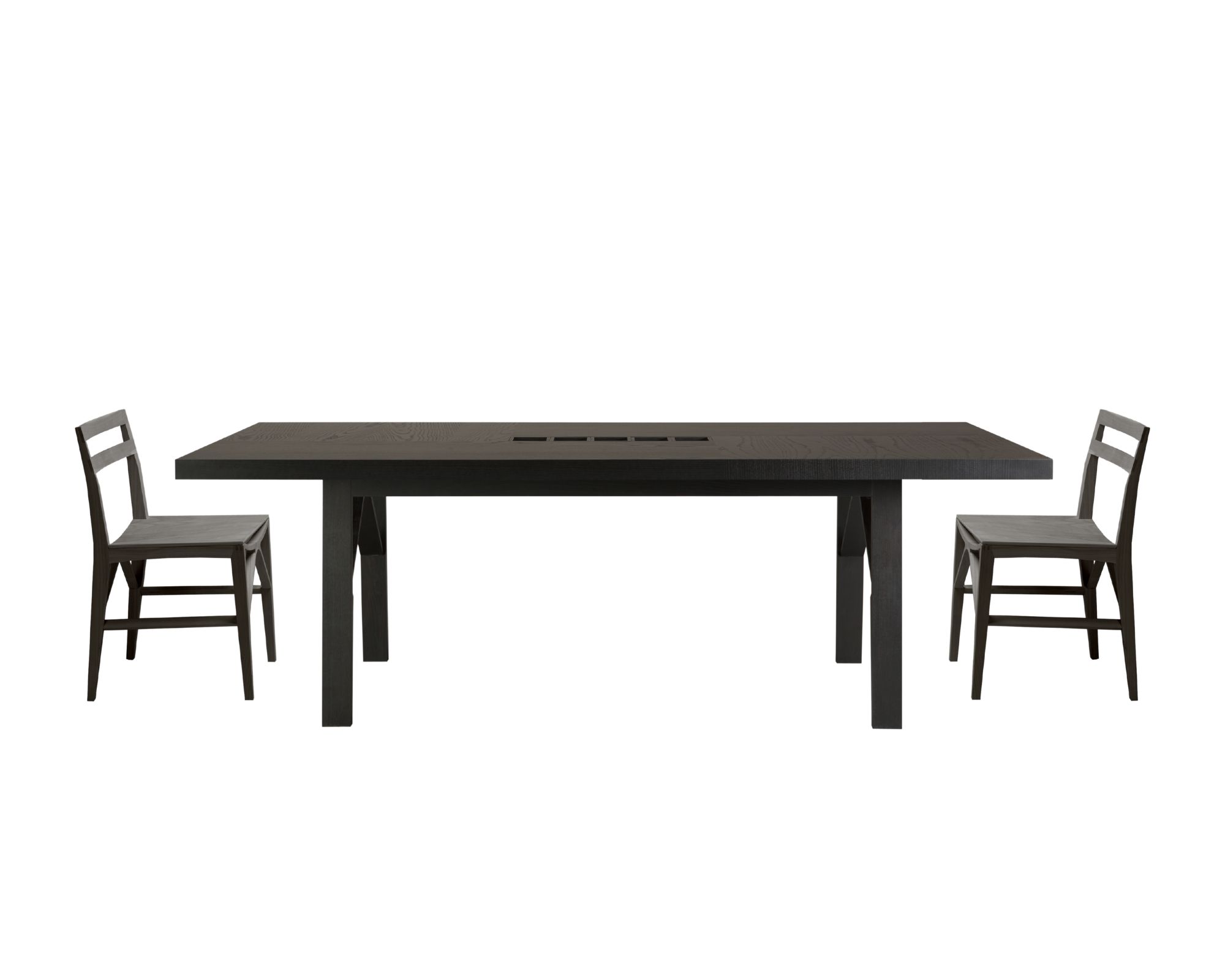 Particolare tavolo in legno di frassino con piano rettangolare e vani porta oggetti al centro, estraibili, proposto con 4 sedie abbinate. Misure sedia: L 50 P 47 H 80 cm Misure tavolo: L 230 P 97 H 77 cm