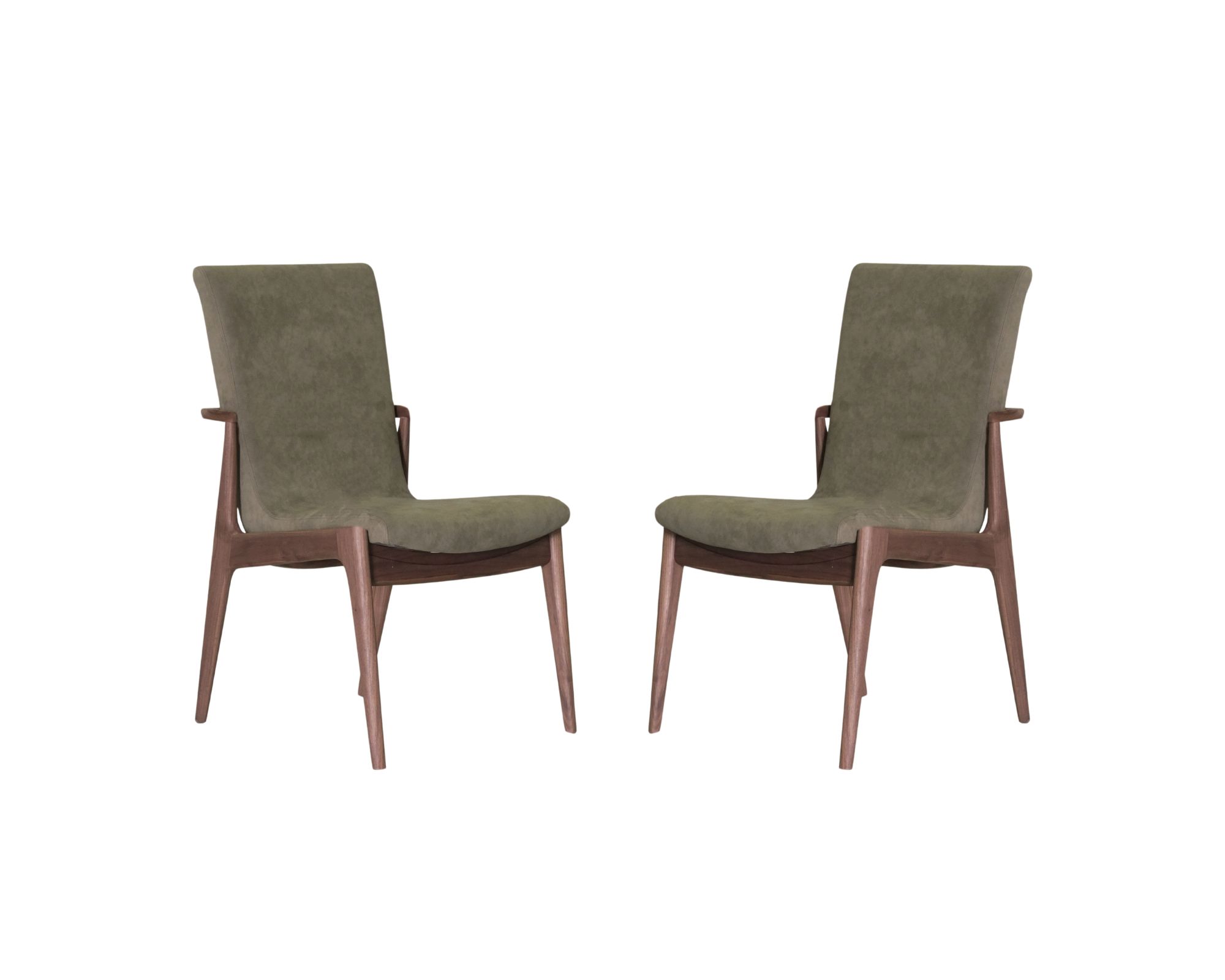 Gruppo di 6 sedie con struttura in legno di noce canaletto tornito. Seduta imbottita e rivestita fronte-retro. Pezzi nuovi, rivestimento scelta.