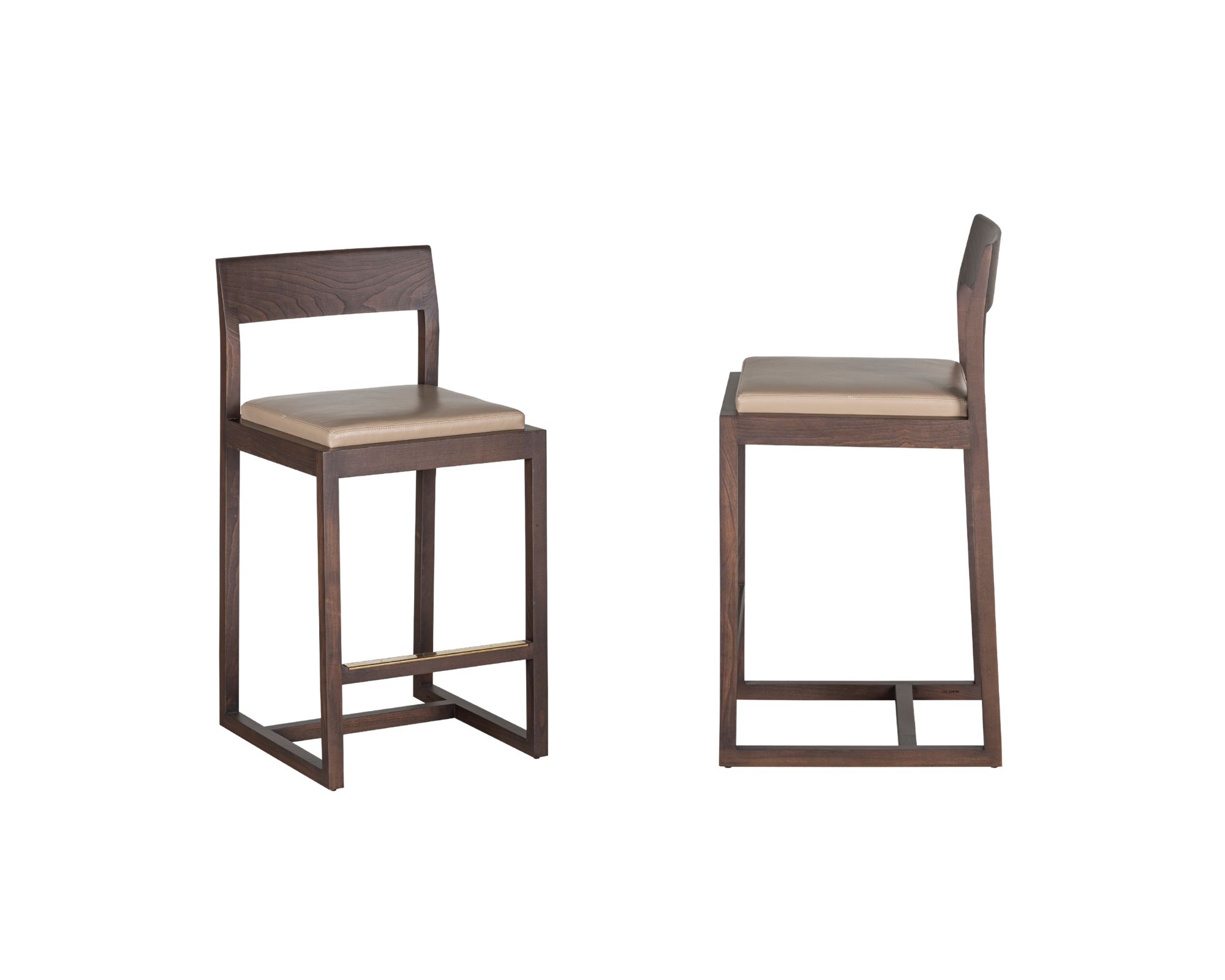 Sgabelli bar in legno di frassino con schienale in legno e seduta imbottita. Pezzi al grezzo realizzabili con finitura e rivestimento a scelta.