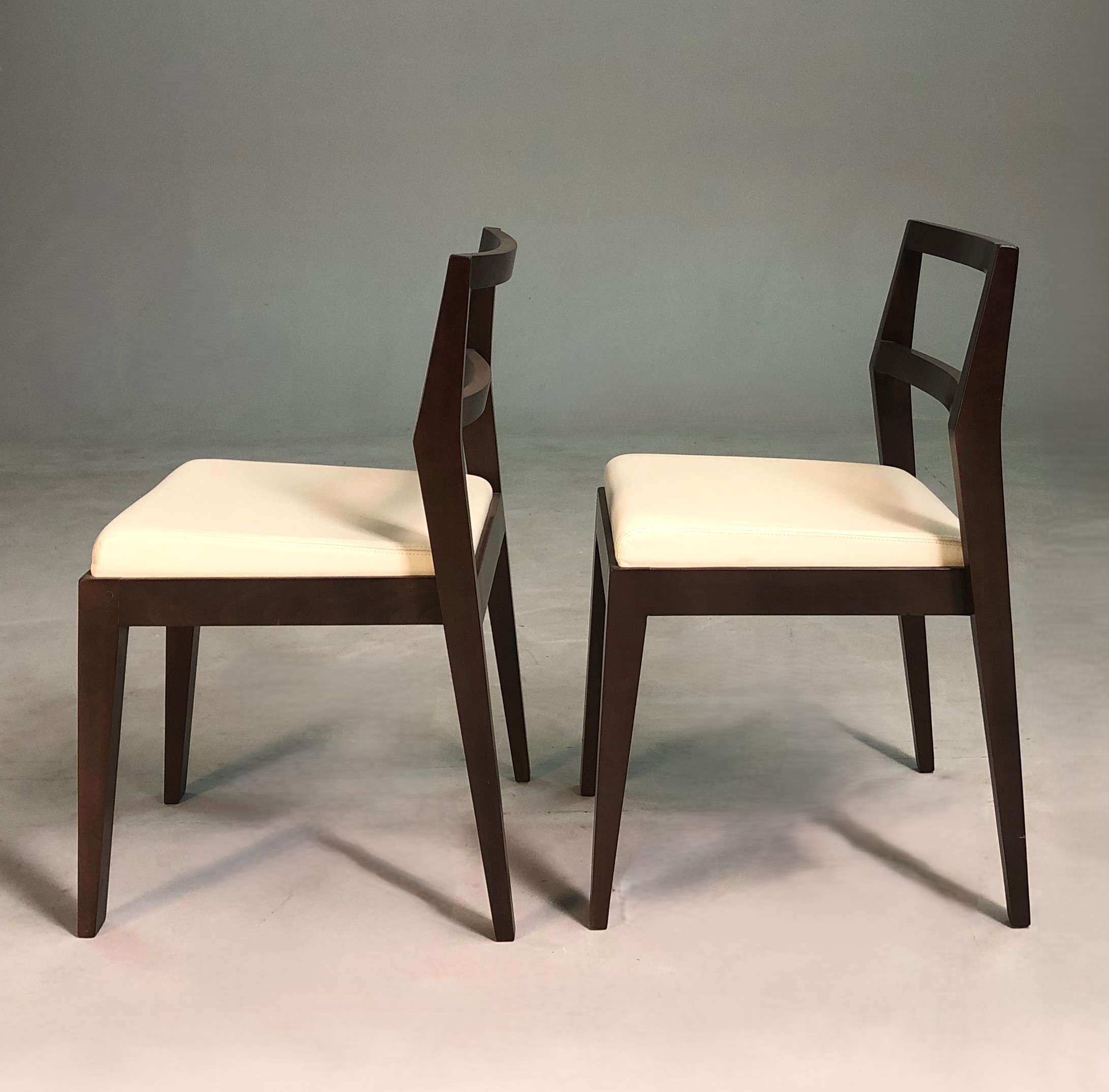 Sedie realizzate in legno di ciliegio con struttura impilabile. Seduta imbottita, rivestita in pelle naturale colore Beige.