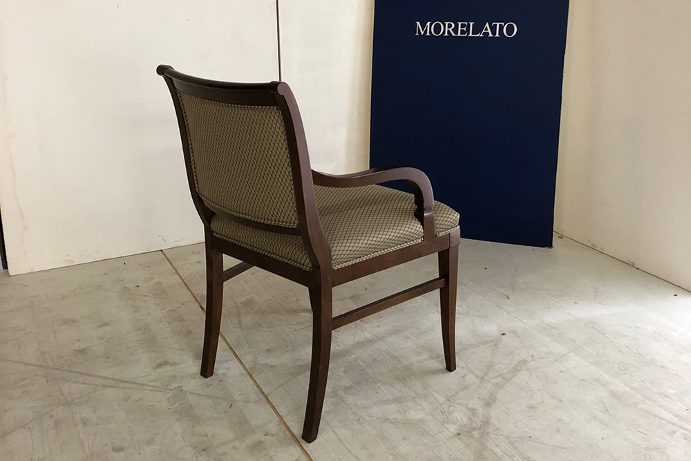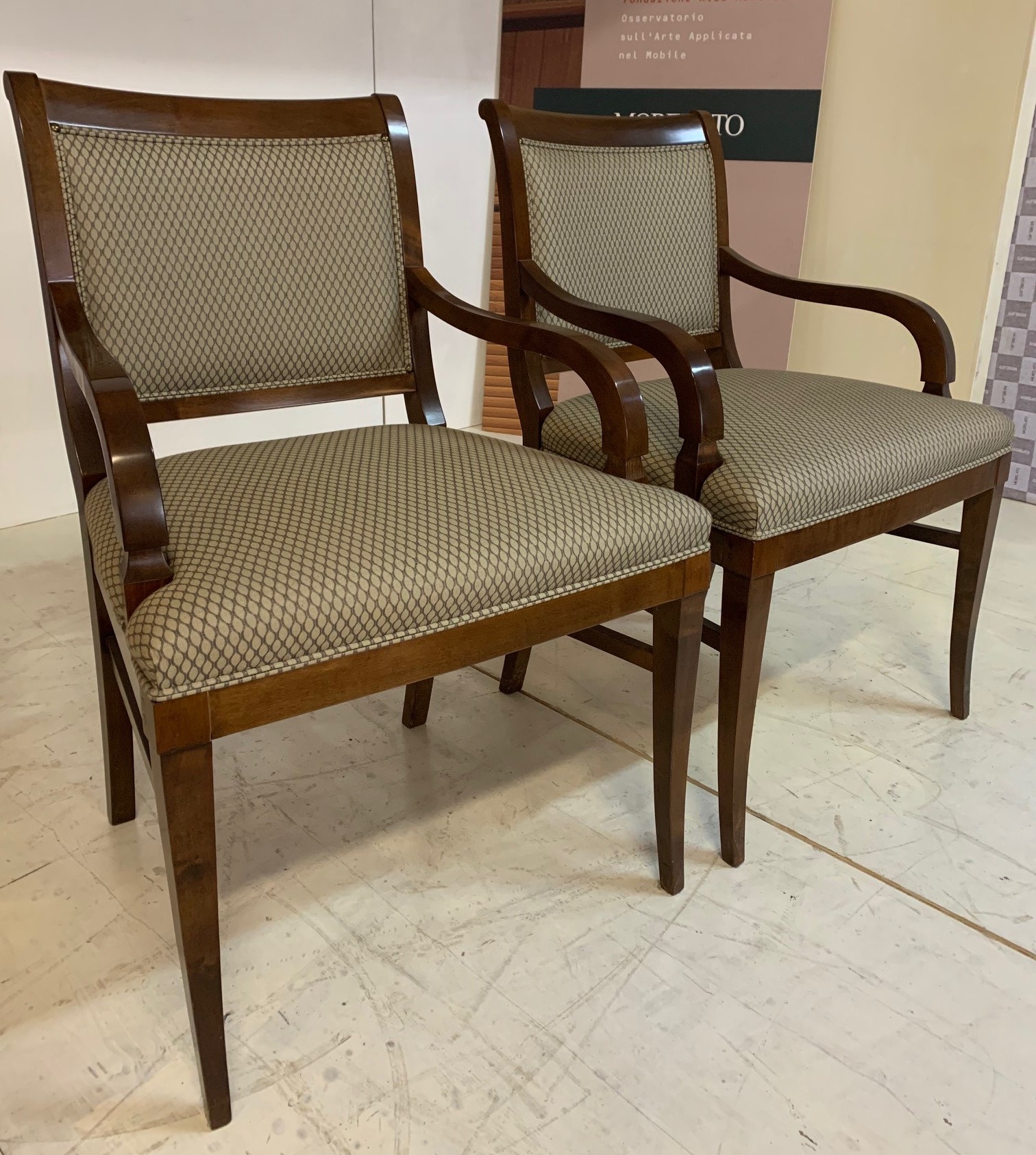 Poltroncine realizzate in legno di ciliegio con braccioli e gambe sagomate. Presentano schienale, fronte-retro, e seduta imbottiti. Rivestimento in tessuto di cotone tono Nocciola con microlavorazione a rombi.