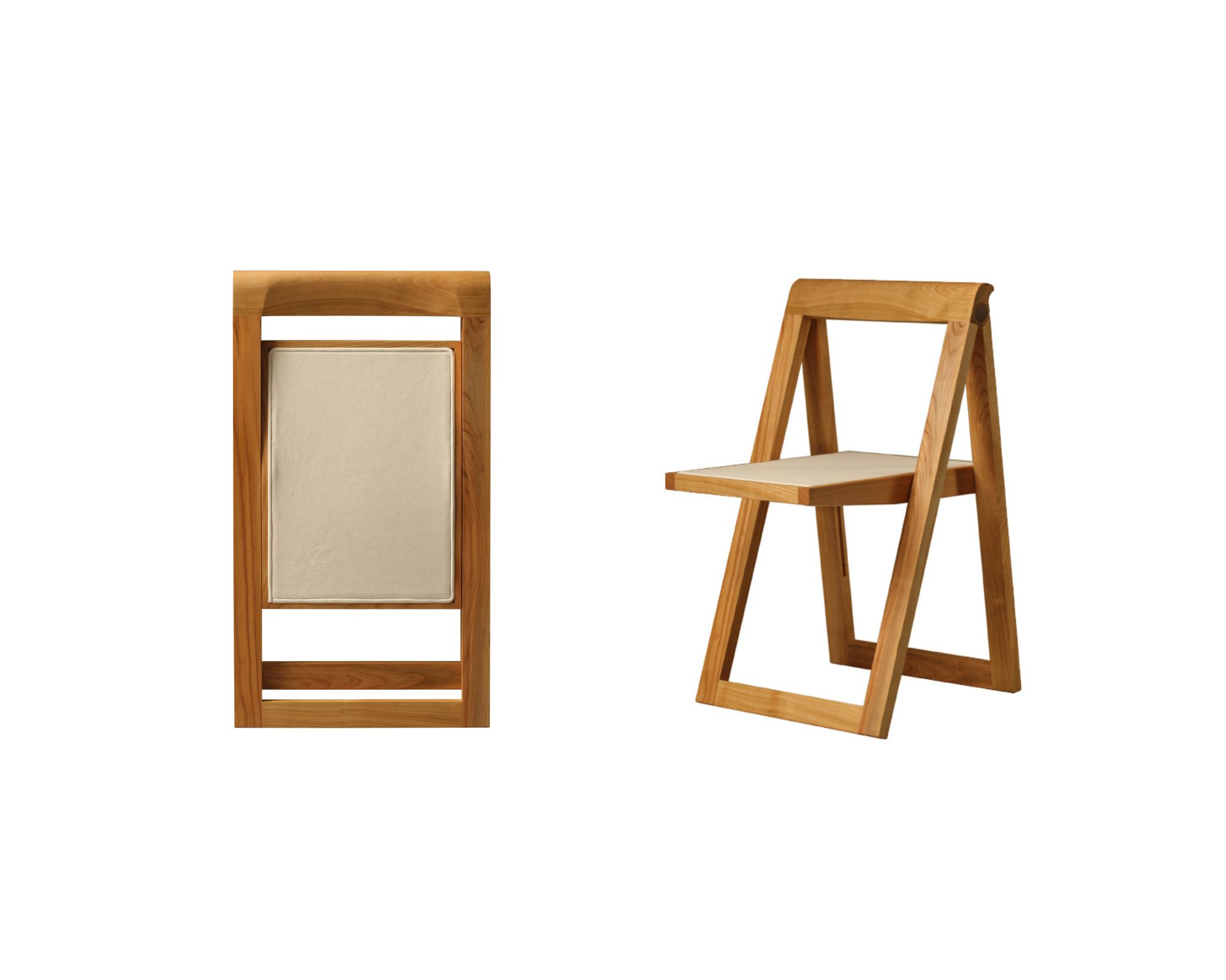 Sedia in legno di ciliegio con struttura pieghevole e seduta rivestita in pelle beige. Ultimi pezzi in ciliegio. Misure sedia chiusa: L 46 P 5 H 83 cm